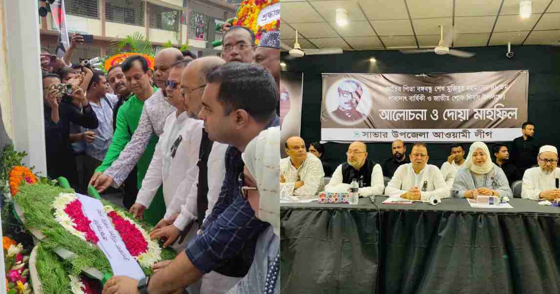 এদিকে, সাভার উপজেলা আওয়ামী লীগের সাধারণ সম্পাদক মঞ্জুরুল আলম রাজীব এর নেতৃত্বে সাভার উপজেলা আওয়ামী লীগের পক্ষ থেকে জাতীয় শোক দিবস উপলক্ষে স্বাধীনতা চত্বরে বঙ্গবন্ধু'র প্রতিকৃতিতে পুষ্পার্ঘ্য অর্পণ করা হয়। পরে উপজেলা পরিষদের মিলনায়তনে উপজেলা আওয়ামী লীগের আয়োজনে আলোচনা সভা ও দোয়া মাহফিল অনুষ্ঠিত হয়।